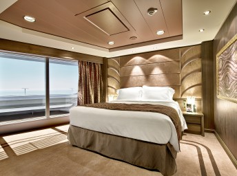Suite s balkónom/panoramatickým oknom: 21-47m², kajuta s manželskou posteľou (na požiadanie 2 oddelené postele) a rozkladacia pohovka. Klimatizácia, kúpeľňa s vaňou, toaletný stolík, priestranná skriňa, interaktívna TV, telefón, minibar, sejf, sušič na vlasy. Balkón so stolíkom a stoličkami/panoramatické okno. Internetové pripojenie (za poplatok).