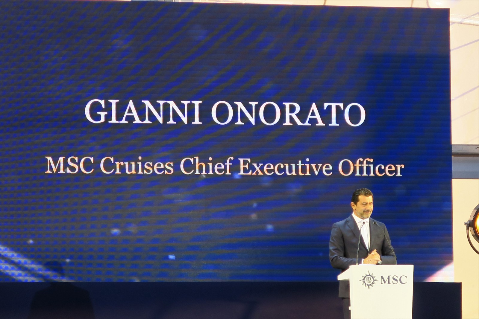Prejav predniesli postupne Pierfrancesco Vago (výkonný prezident MSC Cruises), Laurent Castaing (generálny riaditeľ lodeníc STX France), Luc Lemonnier (nový starosta mesta Le Havre).