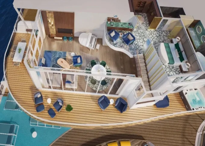 UL - Ultimate Family Townhouse 3-podlažný apartmán. 165 m² + 38 a 23 m² balkóny s výhľadom na more. 7. až 9. paluba vzadu. Max 8 osôb. Výhody Royal Suite Star class. 31 488 € 7 872 € za osobu