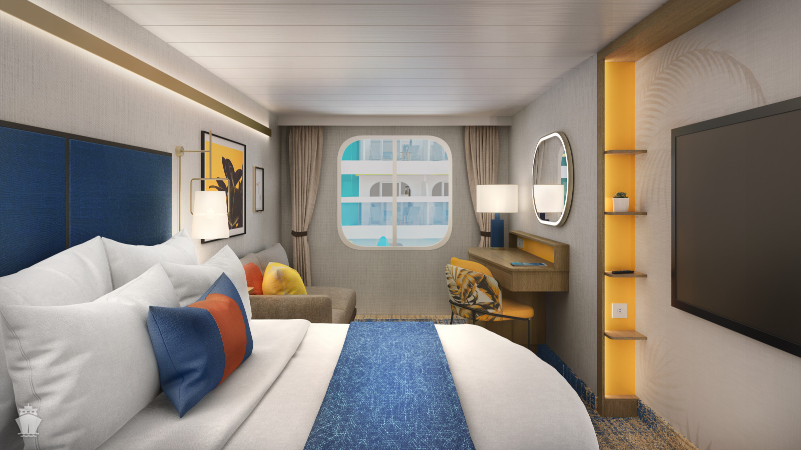 T5 - Vnútorná kajuta s oknom / Surfside Family 17 m². Neotvárateľné okno s výhľadom na štvrť Surfside. 8. paluba vpredu. Max 3-4 osoby. 5 844 € 1 461 € za osobu