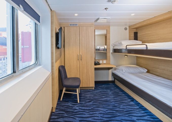 J3 - Vonkajšia kajuta Polar / obmedzený výhľad 11-12 m². Neotvárateľné okno s obmedzeným výhľadom. Spodné lôžko + 2 vyklápacie, Tv, sejf, varná kanvica. 6. paluba. Max 3 osoby. | 13 762 € 6 881 € za osobu |