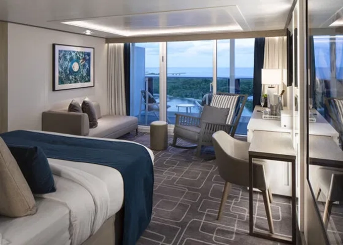 | IC - Iconic Suite 176 m² + terasa s vírivkou 64 m². 2 spálne, 2 kúpeľne (1 s vírivkou).12. paluba. Max 6 osôb. Výhody Retreat Suite + Icon Suite extra: Dizajn: Kelly Hoppen. Používanie fitness bicyklov Peloton® v kajute, In-suite Personal Retreat Host's komora, obliečky Celebrity eXhale™ s kašmírovým King matracom, elektronické ovládanie zariadení v miestnosti pomocou dotykovej obrazovky | 35 763 € 11 921 € za osobu |