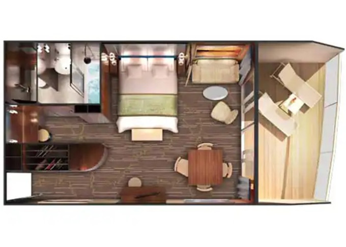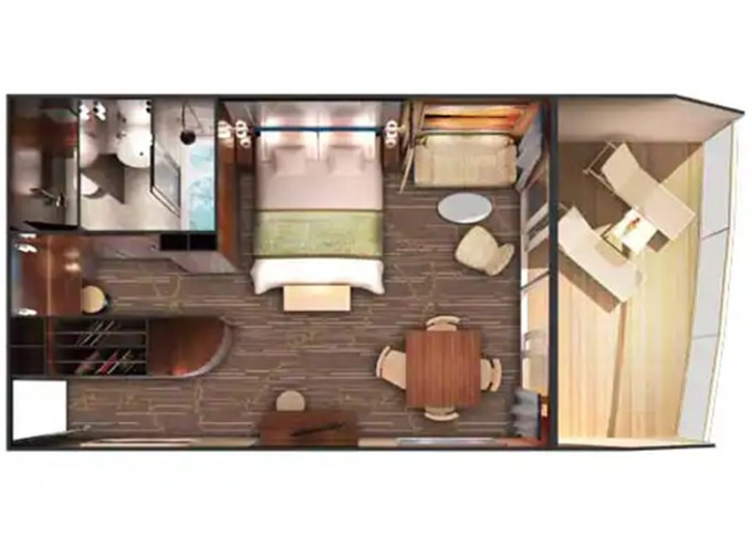 | SN - Aft-facing Penthouse Suite 32-34 m² / balkón 5-7 m². 8,9. paluba - vzadu. Max 3 osoby. Výhody Suite. | 7 758 € 3 879 € za osobu |