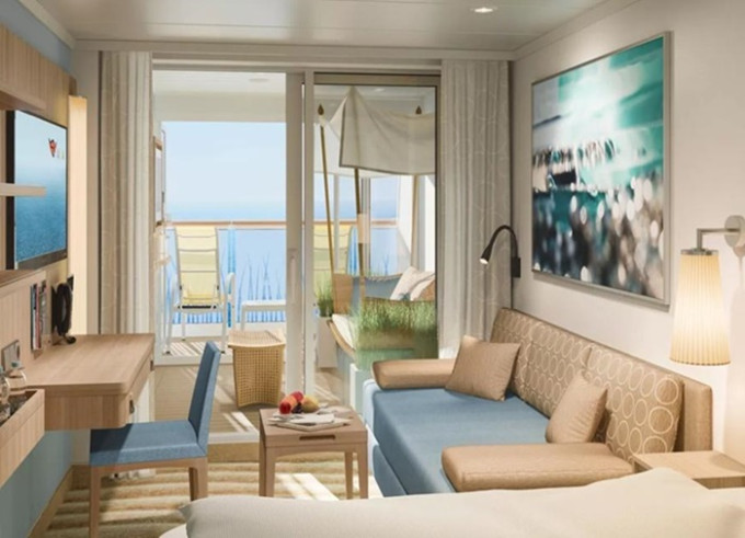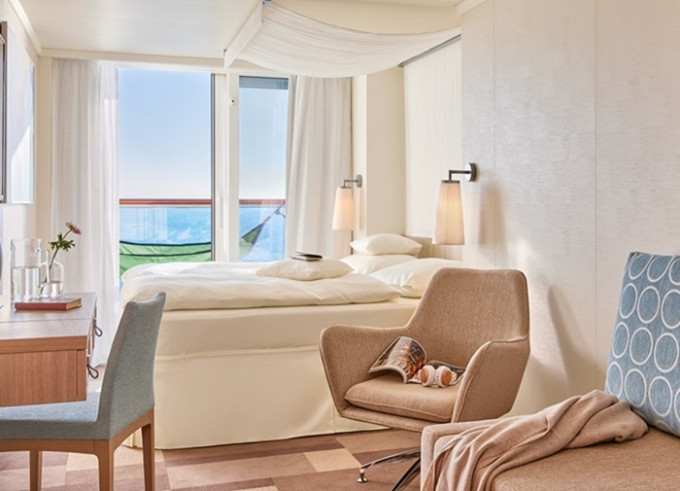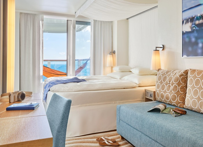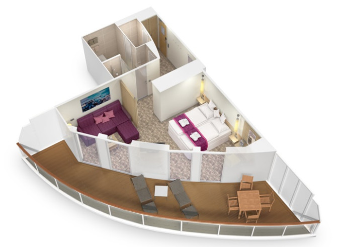 JA - Junior Suite s balkónom PREMIUM34 m² + terasa 27,5 m². 8. až 15. paluba. Max 4 osoby. Cenový model Premium + výhody Junior Suite.