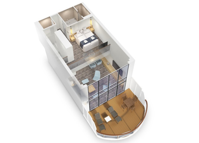 SC - Suite PREMIUM40 m²+ terasa 33 m². 8. až 15. paluba. Max 5 osôb. Cenový model Premium + výhody Suite.