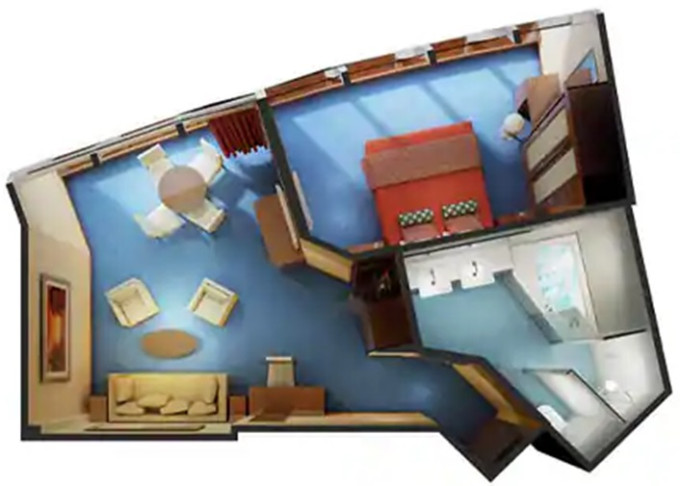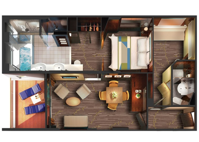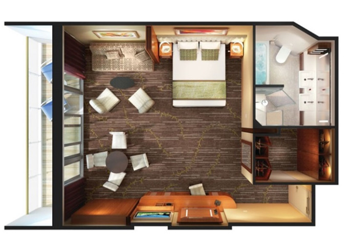 S6 - Deluxe Owner's Suite 61-68 m². Celoplošné neotvárateľné okná. 12. paluba - vpredu. Max 4-6 osôb. Výhody Suite. | 6 472 € 3 236 € za osobu |