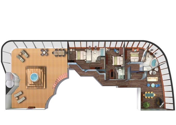 S1 - Garden Villa - 3 spálne 621 m² / balkón s vírivkou 413 m². 14. paluba - stred. Max 7 osôb. Výhody Suite. | 26 798 € 13 399 € za osobu |