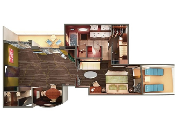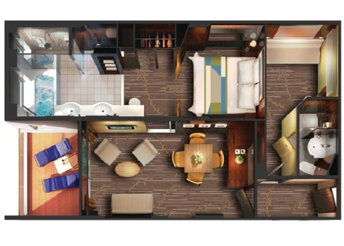 S2 - Deluxe Owners Suite s 2 balkónmi 78-83 m² / balkón 13 m². 10. paluba - vpredu. Max 4 osoby. Výhody Suite. | 11 020 € 5 510 € za osobu |
