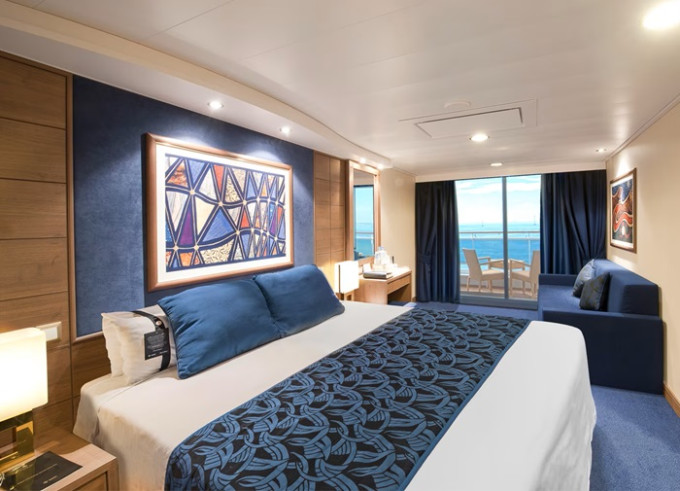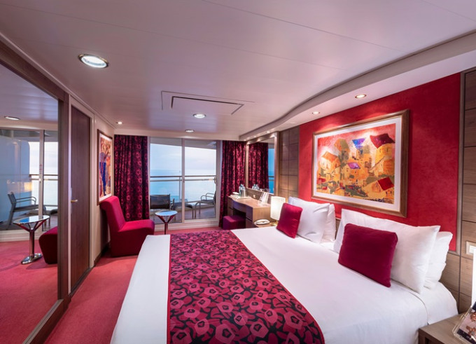 Suite s balkónom: cca 31m² kajuta s manželskou posteľou (na požiadanie 2 oddelené postele) a rozkladacia pohovka. Klimatizácia, kúpeľňa s vaňou, toaletný stolík, priestorná skriňa, interaktívna TV, telefón, minibar, sejf, sušič na vlasy. Balkón so stolíkom a stoličkami. Internetové pripojenie (za poplatok).