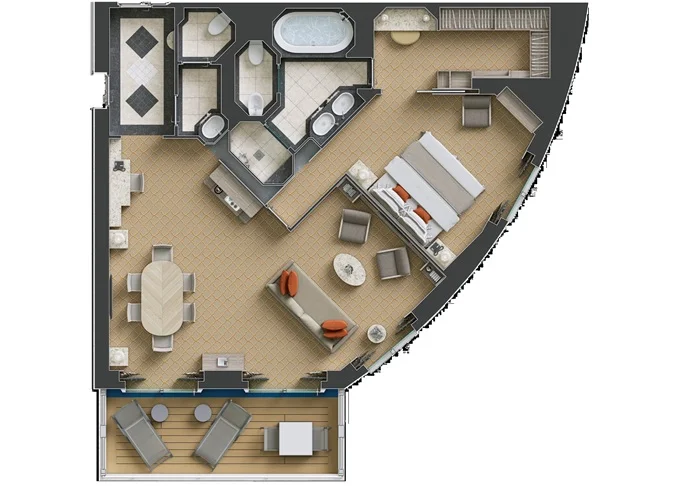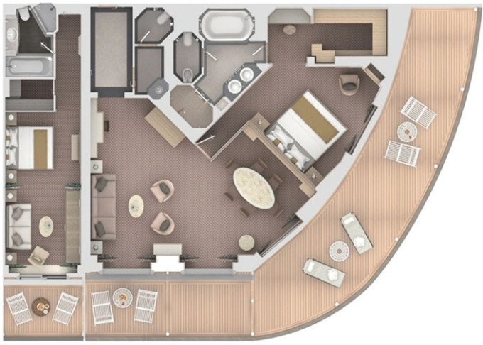 | R1 - Royal Suite 1 105 m² (vrátane balkónu). 7. paluba vpredu. Max 3 osoby. | 54 000 € 18 000 € za osobu | ||