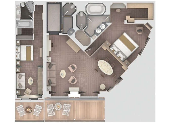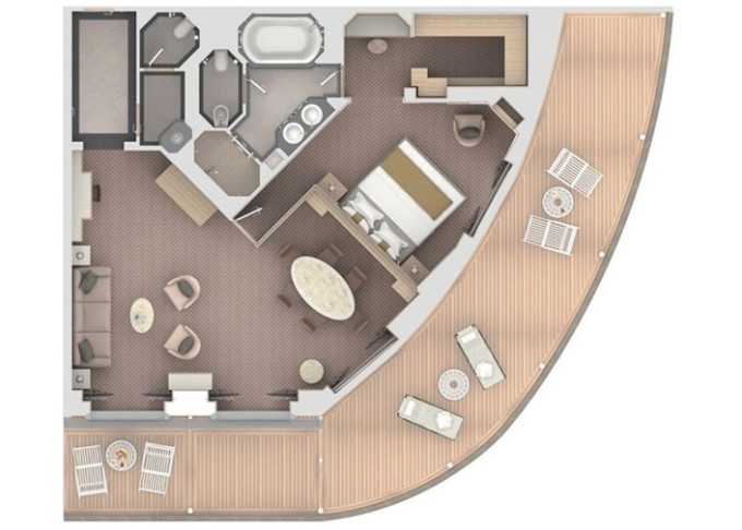 | O1 - Owner's Suite 1 88 - 98 m² (vrátane balkóna 12 m²). 9. paluba - stred. Max 3 osoby. | 67 500 € 22 500 € za osobu | ||