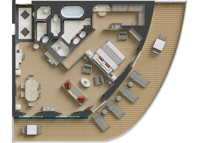 | O1 - Owner's Suite 1 88 - 98 m² (vrátane balkóna 12 m²). 9. paluba - stred. Max 3 osoby. | 90 000 € 22 500 € za osobu | ||