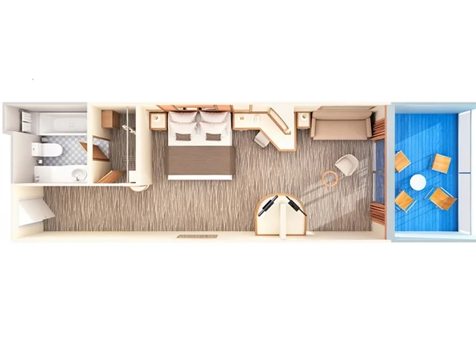 8D - Kajuta s balkónom 21,5 m² (vrátane balkóna). 12. paluba stred, vzadu; 14. paluba vpredu. 1 010 € 505 € za osobu