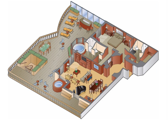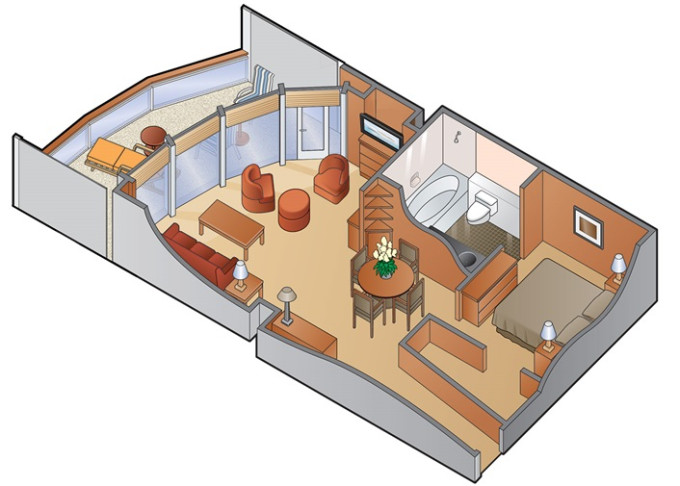 RS - Royal Suite 51 m² + balkón s vírivkou 18 m². Kúpeľňa s vírivkou. 6. paluba vzadu. Max 3 osoby. Výhody Suite The Retreat. 17 780 € 8 890 € za osobu