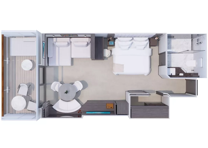 Serenity Residence Suita 60 m² + Terasa s vírivkou, sedením, pohovkou a lehátkami 7. paluba: 53 m² / 9. paluba: 66 m². Spálňa s obývacou a jedálenskou časťou, šatník. Koktailová súprava, minibar, kávovar, vodná kanvica, ďalekohľad, sejf, mramorová kúpeľňa s vaňou a sprchou. Taška Technogym Case Kit a Technogym Bench. Fľaša šampanského na privítanie. Služby osobného majordóma. Max kapacita 3 dospelí alebo 2 dospelí + 2 deti pod 18 rokov. 102 600 € 25 650 € za osobu