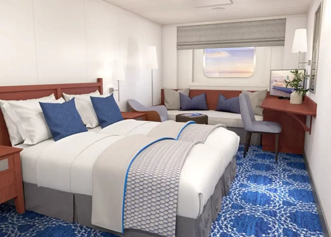 XBO - Kajuta s oknom Cosmos / obmedzený výhľad 14 m². Neotvárateľné okno s obmedzeným výhľadom. 6,7. paluba. Max 4 osoby. | 1 698 € 849 € za osobu | ||
